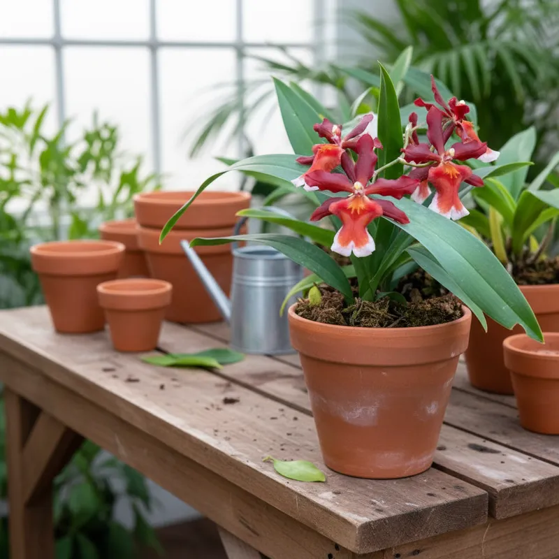 Solo: O substrato deve ser bem aerado e drenado, permitindo que as raízes respirem adequadamente. Uma mistura de casca de pinus, esfagno e carvão vegetal é ideal para a Oncostele H. F. Sangria, proporcionando a aeração e drenagem necessárias. Trocar o substrato a cada 2-3 anos ajuda a manter suas propriedades e evita a compactação, promovendo um ambiente saudável para a planta. Vasos de barro com furos ou cestos de arame são recomendados para facilitar a drenagem.